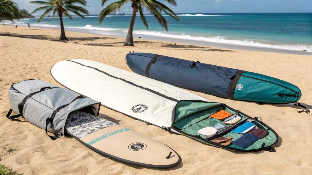 - Travel Bags: These bags are more heavily padded and feature reinforced construction for protecting your board during air travel or long road trips. [See also: Best Surfboard Travel Bags]