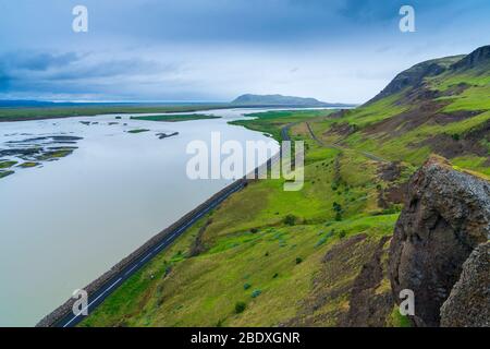 Þjórsá originates from the Hofsjökull glacier in the Icelandic Highlands. The glacier’s meltwater feeds the river, giving it a glacial character – often silty and opaque due to suspended sediments. From its source, Þjórsá flows southwards for approximately 230 kilometers (143 miles), making it the longest river in Iceland. Its course takes it through diverse landscapes, from the barren Highlands to fertile agricultural plains.